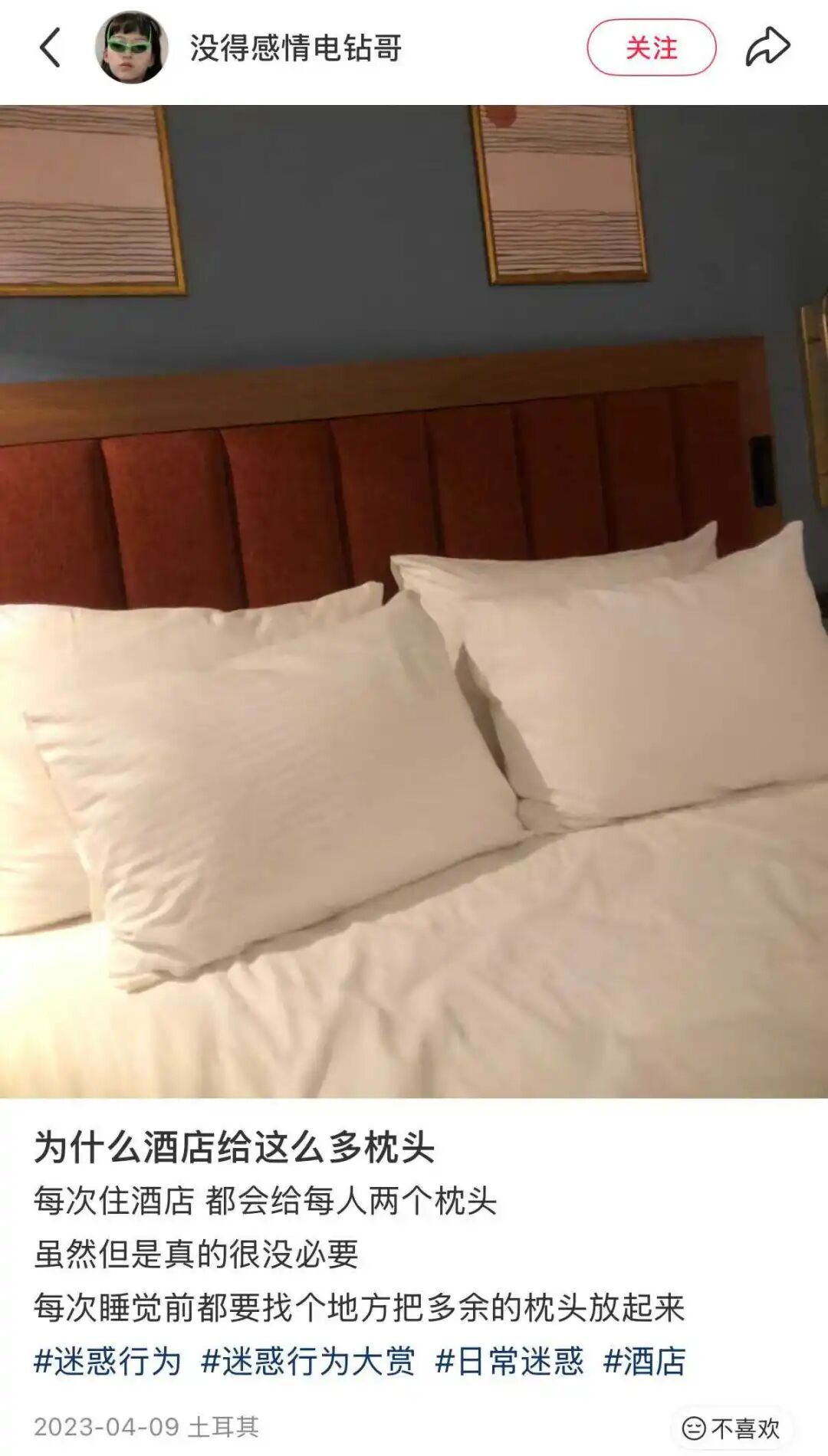 不过,两人睡的大床房,放两个枕头不就够了,为什么要放四个呢?而且,不只在国内是如此,有网友在海外住酒店,同样遇到了这一情况,并抱怨每次睡觉还要找个地方放用不上的枕头。